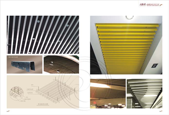 金屬天花分為:標準鋁天花、U型鋁方通、圓管天花、掛片天花、格柵組合天花、條扣天花、遮陽天花等。